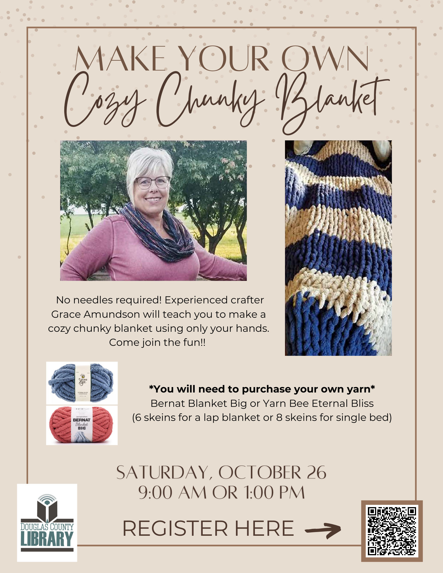No needles required! Experienced crafter Grace Amundson will teach you to make a cozy chunky blanket using only your hands. Come join the fun!!